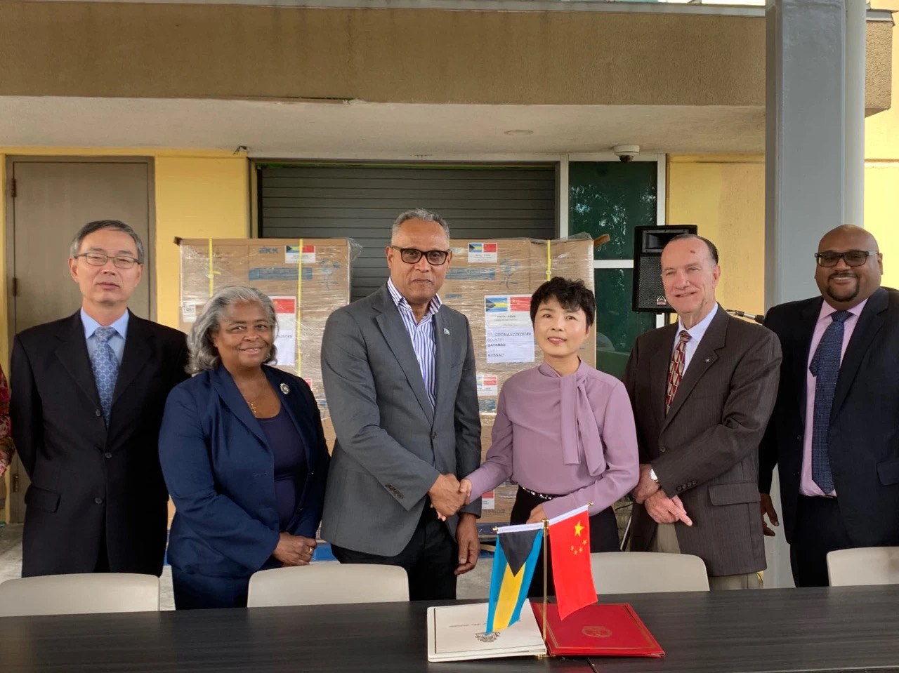 4月6日,中国驻巴哈马大使馆和巴卫生部在巴玛格丽特公主医院共同举行中国-加勒比发展中心援巴抗疫物资交接仪式,巴哈马卫生部长达维尔和戴庆利大使共同出席并签署交接证书,巴卫生部、公共医院管理局以及使馆代表等参加。