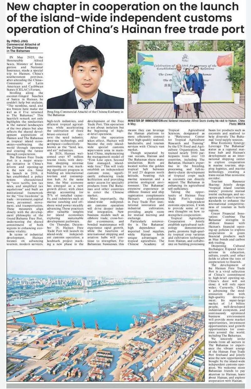 12月18日,海南自贸港封关运作首日,驻巴哈马使馆经商工作负责人彭晶在巴第一大纸媒《论坛报》发表署名文章《海南自贸港封关运作 开启中巴合作新篇章》,详细介绍海南自贸港建设及封关运作的重大意义,宣介中国坚持高水平对外开放,与世界各国共享发展机遇,欢迎更多巴哈马人把握封关运作新机遇,关注海南、了解海南、与海南合作,促进两国经贸合作和双边关系发展。